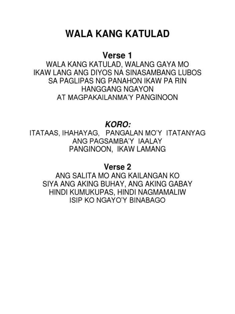 Awitin ko man Lahat ng awit sa mundo Di ko kayang ilarawan ang Kadakilaan mo Kulang ang lahat Tula Maging mga Salita Upang ihayag Ang kabutihan mo. Wala Kang Katulad lyrics a Tagalog worship song by Sherwin Bob Diaz. To God be the GloryAwitin ko manLahat ng awit sa mundoAy di kayang ilarawan Ang Kadakilaan moKulang ang mga tulaKulang maging mga salita Upang ihayag.