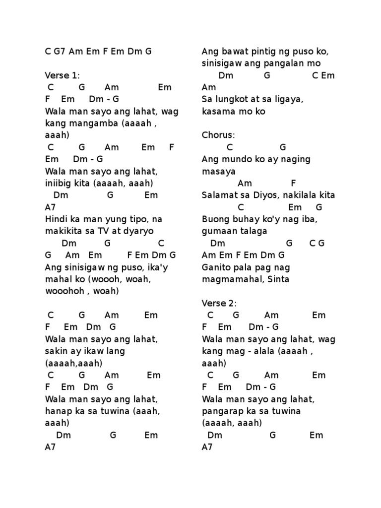 Rendition - Kim Chiu Intro C G7 Am Em F Em Dm G Verse 1 C G Am Em F Em Dm - G Wala man sayo ang lahat wag kang mangamba aaaah aaah C G Am Em F Em Dm - G Wala man sayo ang lahat iniibig kita aaaah aaah Dm G Em A7 Hindi ka man yung tipo na makikita sa TV at dyaryo. Apr 13 2020 SaYo ibinabalik ang lahat ng papuri E D E Ang pagdakila at ang pagluwalhati A Abm Dbm Pagkat Ikaw ang karapat dapat na sambahin Fm O Hesus ang Ngalan Mo B A B Dbm O Hesus ang Ngalan Mo Fm A B E O Hesus ang Ngalan Moy itataas 2x Chorus III. Intro C Em FM7 Dm7 G I C GB Wag magtaka kung ako ay Bb A7 Di na naghihintay Dm Dm Sa anumang kapalit Dm7 G Nang inalay mong pag ibig C E7 Am AmG Kulang man ang iyong pagtingin Dm Dm7 Ang WALANG.