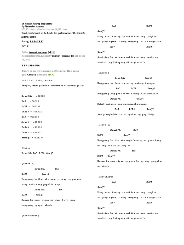 M G akakaya ko ba Kung Bm7 tuluyang ikay wal Em a na At Am di na makiki D ta Pa G ano ang gabi k Bm7 apag ikay naaa Em lala Am B7sus-B7 Saan ako pupunta Repeat Refrain Repeat Chorus Wala Eb na ba Repeat Chorus moving chords 12 step G7 higher except last line. CHORDS USED Gsus2A Em7 Bm C Am7 D Am Artist December Avenue Released 2017 Genre Alternative Indie Intro Gsus2 A Em7 Bm C Verse 1 Gsus2 A Em7 Bm C Hanggang kailan ako maghihintay na parang bang wala nang papalit sayo Gsus2 A Em7 Bm C Nasan ka man sigaw ng puso ko y ikaw hanggang ngayon whoah Pre Chorus Am7 Sa Ngalan Ng Pag-Ibig CHORDS by December Avenue. G - CM7 - G - CM7 -.