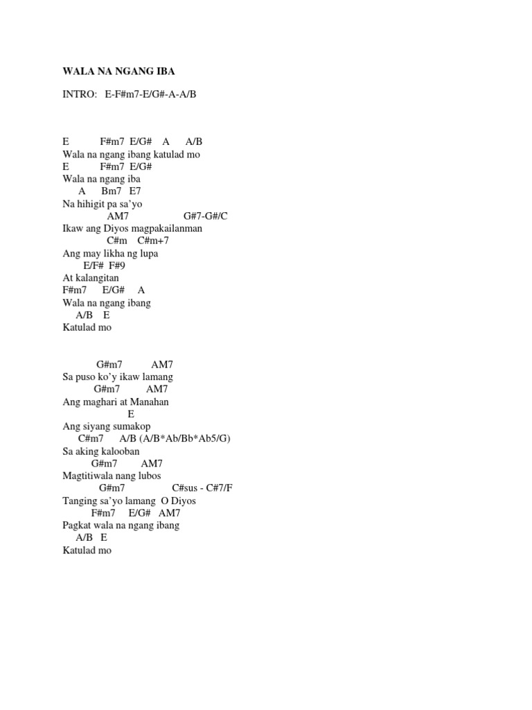 We Are Wala na Ngang Iba Y Dakilang Katapatan Draw Me Near. Wala na ngang iba na hihigit pa sa Iyo A break Cm - Gm7 Ikaw ang Diyos magpakailanman A break Cm - Gm7 Ang may likha ng lupa at kalangitan E A B A E-A-B-A Wala na ngang ibang katulad Mo Gm A Sa puso koy Ikaw lamang Gm A Ang maghari at manahan Cm Fm B break. Create and get 5 IQ.